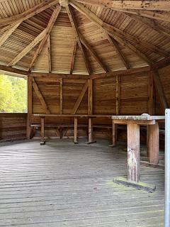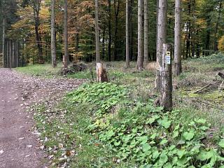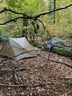 Bij de waymark (rode puntje) is tentenplek en bij driehoek is de houtstapel en de afslag naar rechts.